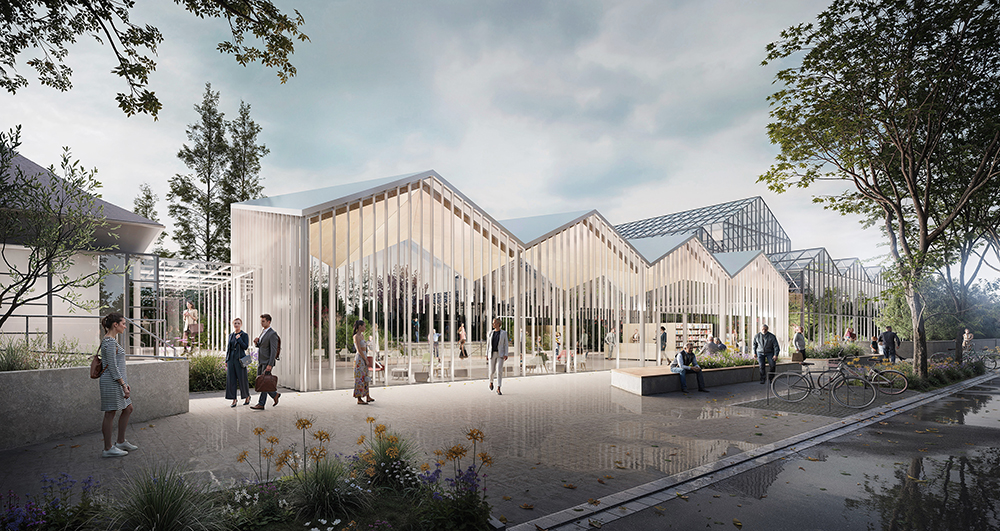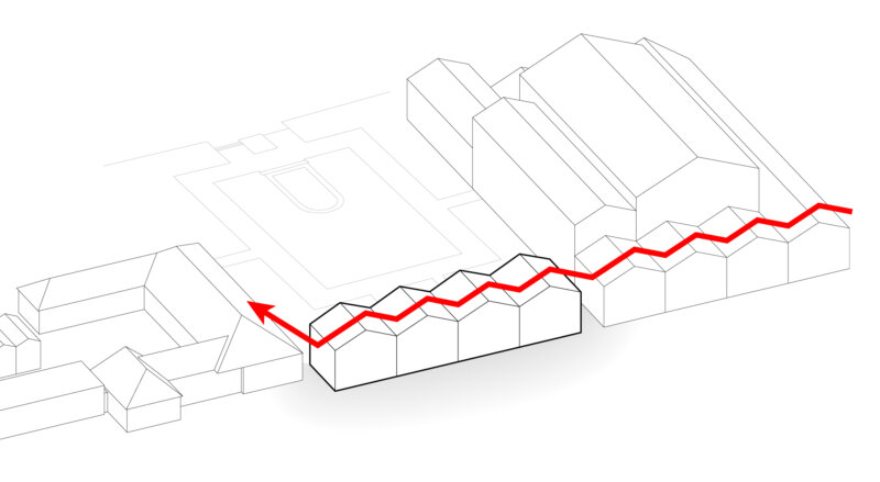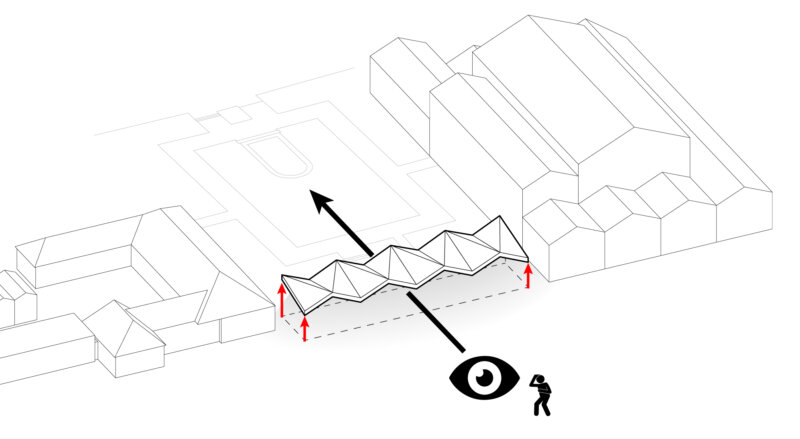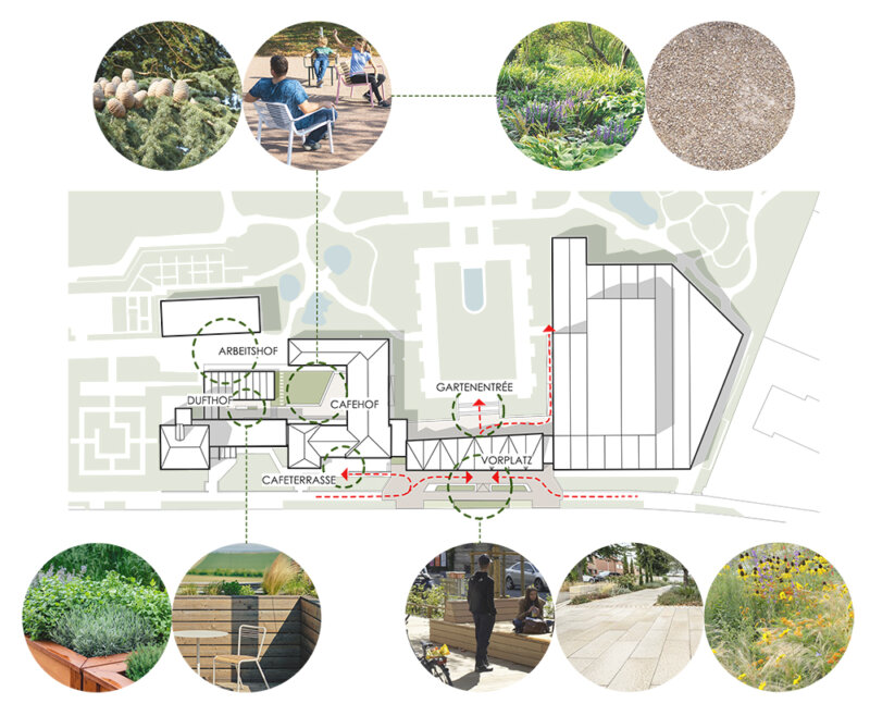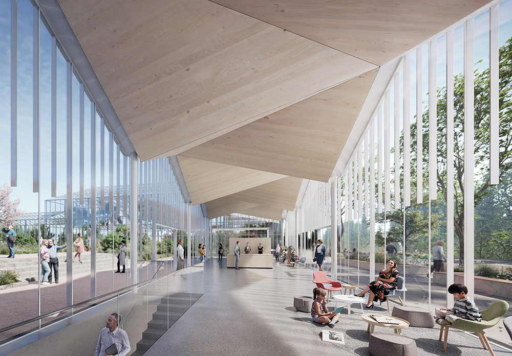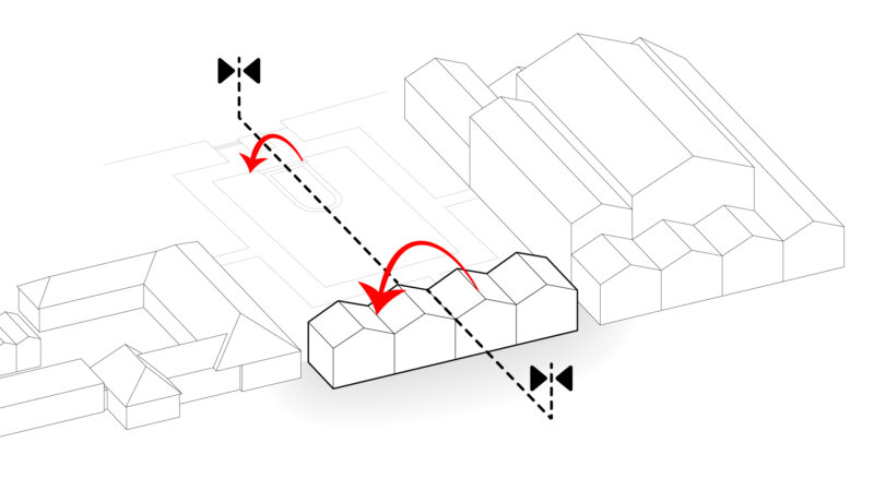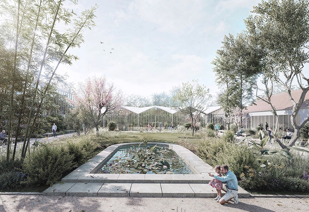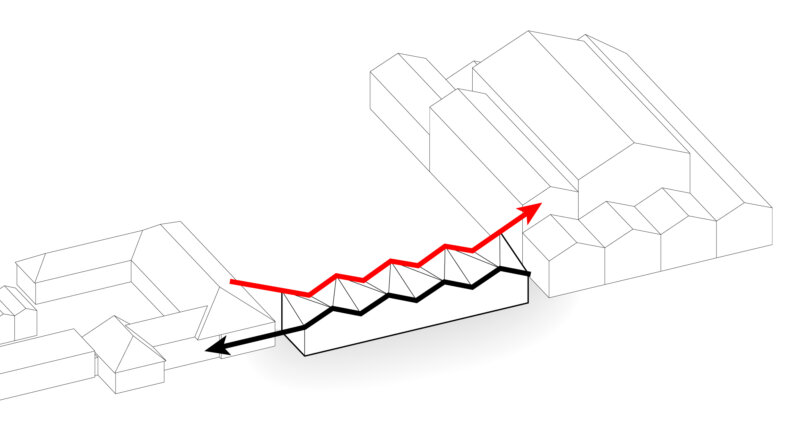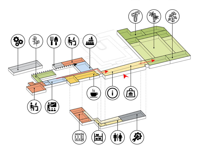 Das Entwurfskonzept basiert auf wenigen, sensiblen Eingriffen in die bestehende Struktur, einer maßvollen Ergänzung sowie einer Neuorganisation der Funktionen zur Steigerung der Aufenthaltsqualität und betrieblichen Abläufe des botanischen Gartens. Das neue Eingangsgebäude bildet das zentrale verbindende Element zwischen den westlichen Bestandsbauten mit Café und Seminarbereich sowie den östlich geplanten Glasgewächshäusern. Gestalterisches Leitmotiv ist das aus der Gewächshaustypologie abgeleitete Satteldach, das als dreidimensionale, raumbildende Dachstruktur über dem transparenten Neubau schwebt und klare Sichtachsen in die historische Parkanlage eröffnet. Die Symmetrieachse des Gartens wird durch mittig angeordnete Eingänge betont. Die Bestandsbauten werden nur minimal adaptiert und durch barrierefreie Zugänge ergänzt. Das Zugangsgebäude fungiert als zentraler Verteiler und ermöglicht eine klare Besucherführung zu allen Bereichen. Der Vorplatz wird als offener, einladender Freiraum mit klarer Gestaltung und identitätsstiftenden Aufenthaltsbereichen ausgebildet.