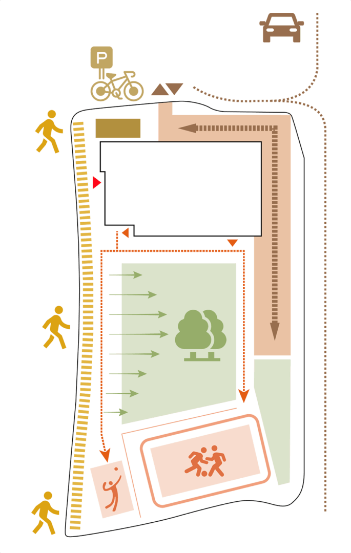 Der Baukörper folgt einer klaren, geometrischen Formensprache und ist kompakt konfiguriert. Seine Platzierung an der Ostgrenze des Planungsgebiets maximiert die Freifläche im Westen, die nach dem Abriss der Bestandsbauten als zusammenhängender Grünraum genutzt wird. Gleichzeitig bleibt der Bestand während der Bauphase nutzbar. Ein zentraler, offener Innenraum nimmt die vertikale Erschließung der Schule auf. Um dieses lichtdurchflutete Gebäudezentrum gruppieren sich die einzelnen Nutzungsbereiche. Während die Unterrichtsräume geschlossener gestaltet sind, öffnen sich Homebases und Lerninseln als Einschnitte bis zur Außenfassade und schaffen räumliche Bezüge zum Freiraum.