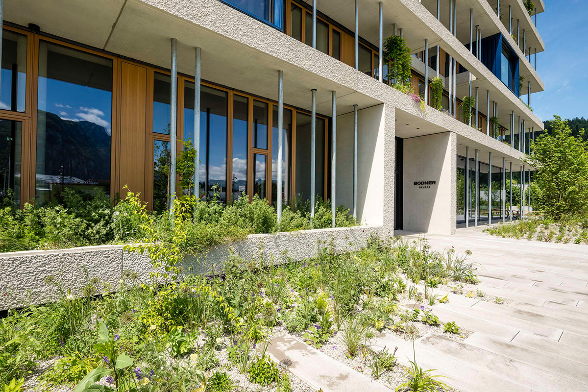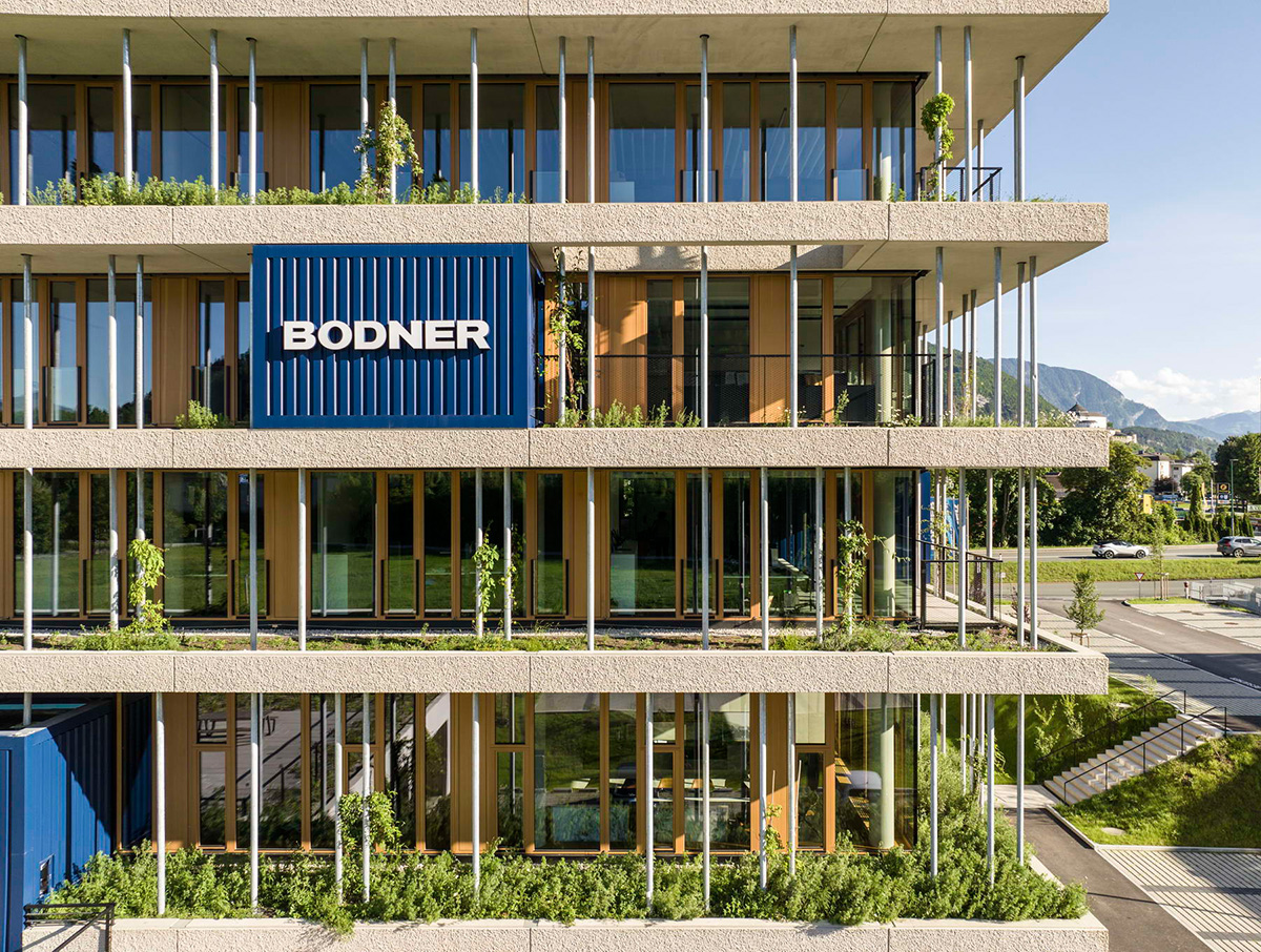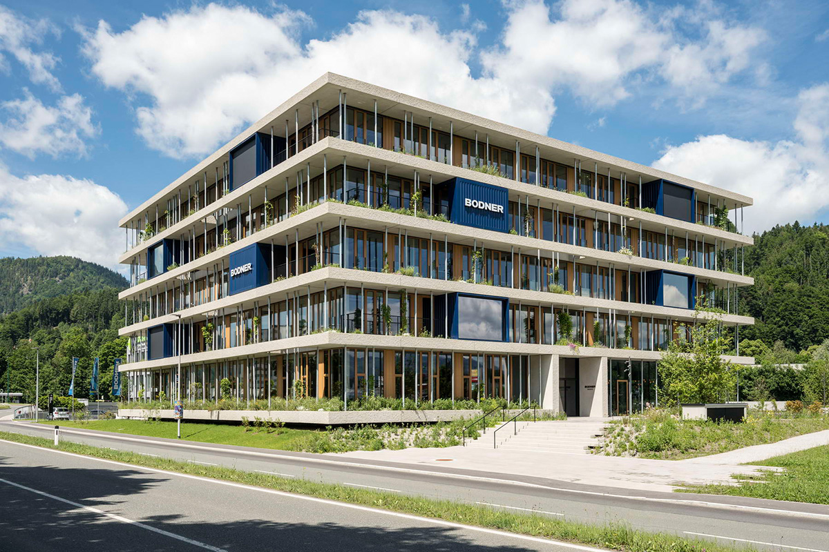 The headquarters is part of the BODNER Campus, which will consist of four buildings when completed. The architectural concept of the building is characterized by massive, striking structures. This refers to the roots and history of the client and its core business as a construction company. The external appearance shows elements of shell structures in the form of roughly cut ceiling edges and associations of construction site containers in the familiar BODNER blue. The precise detailing of glazing, prefabricated cladding and window elements creates an exciting and identity-forming appearance in the new context. The design concept extends from the façade to the interior. Here, the container boxes serve as retreats and meeting booths and are arranged freely in the covered atrium.
