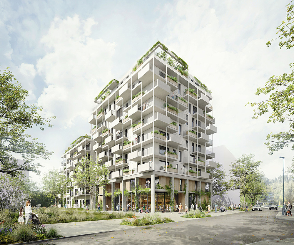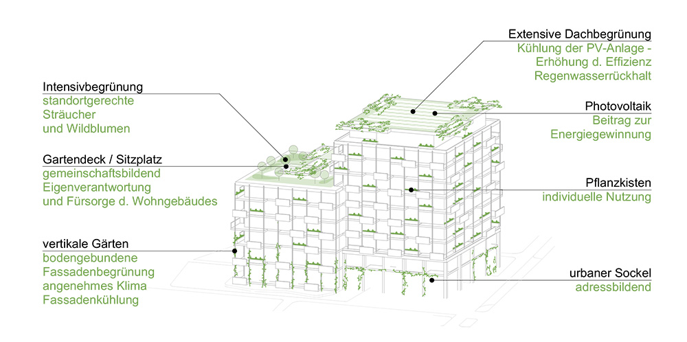 The open spaces continue the principles of the „climate park“. A bright, permeable forecourt faces the street, while green facades, ground-level plantings, and raised beds assigned to individual apartments create a continuous layer of greenery.