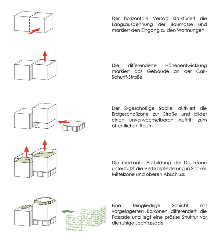The project precisely implements the framework plan and adopts its urban planning structure. Two offset structures with differentiated heights define an activated street space and a quiet, park-side “green center.”