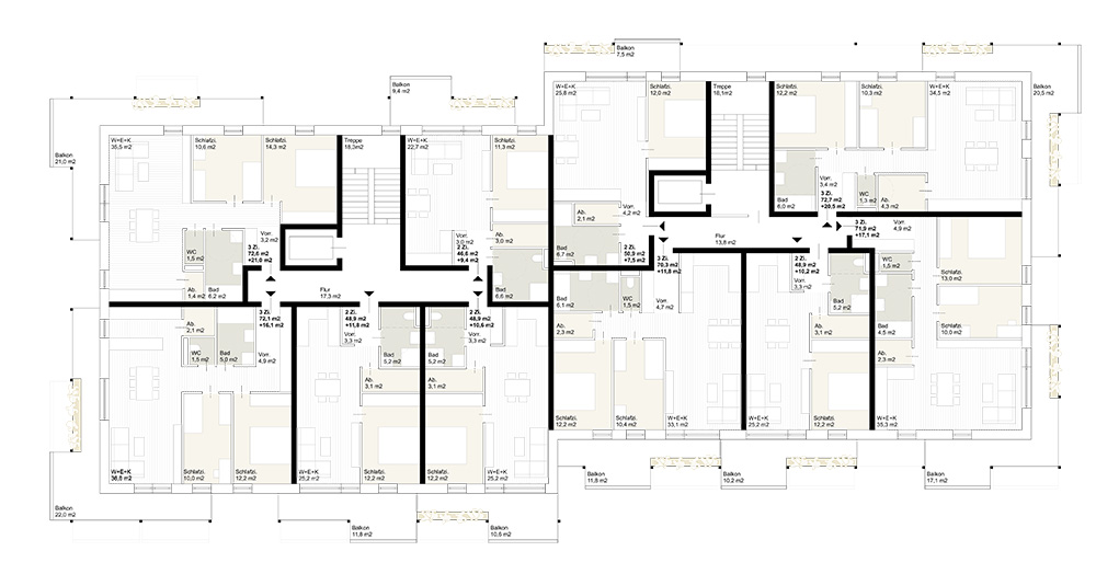 The compact thermal envelope, optimized window areas, and effective shading meet the passive house standard. Comfort ventilation ensures efficiency and comfort. District heating, neighborhood-internal systems, and photovoltaics complement the energy concept.